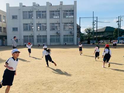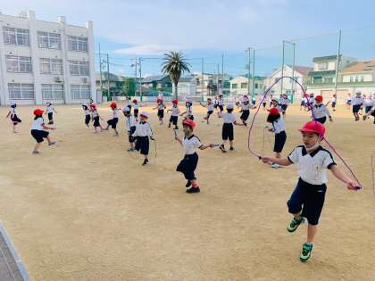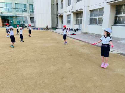 運動場の水たまりに氷が張るほどの寒い日でしたが、ポップコーンの曲に合わせて、元気に縄跳びをしました。