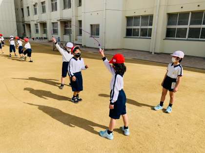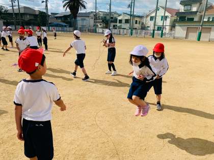 友達の回す縄を上手に跳ぶことができています!