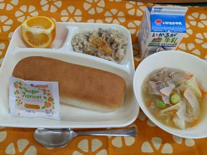 2月7日(月)のこんだては、「押し麦のグラタン、スープ、いよかん、コッペパン、アプリコットジャム、牛乳」です。