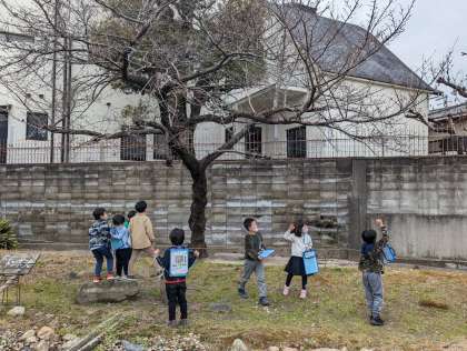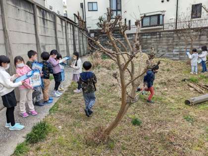 校庭でチューリップや松ぼっくりを観察した後、自然観察園に向かいました。