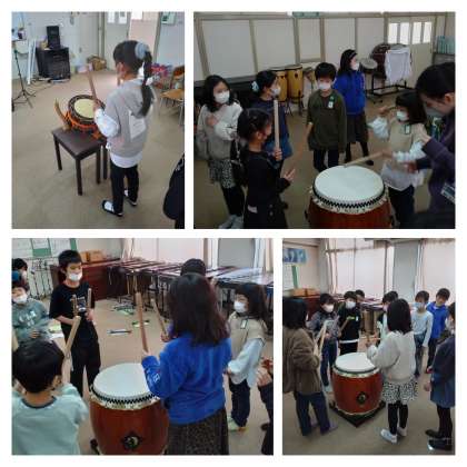 音楽室で、お囃子で使われている「長胴太鼓」と「締め太鼓」をみんなでたたいて、お祭り気分を味わいました。