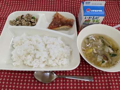 2月17日(木)のこんだては、「あかうおのレモンじょうゆかけ、うすくず汁、高野どうふのいり煮、ごはん、牛乳」です。