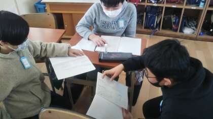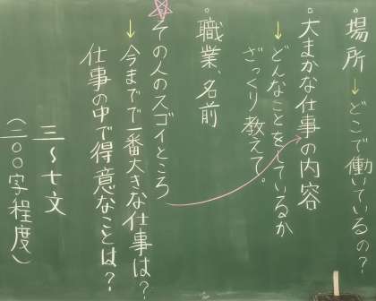 教材「プロフェッショナルたち」を基に、どんなことを質問するとよいか話し合い、具体的な質問を考えることができました。