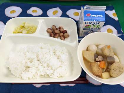 2月21日(月)のこんだては、「関東煮、はくさいの甘酢あえ、とら豆の煮もの、牛乳」です。