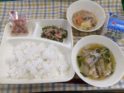 3月1日(火)のこんだては、「変わり肉じゃが、鶏肉と白菜のすまし汁、さんどまめのごまあえ、ごはん、牛乳」です。このこんだては、昨年度の学校給食献立コンクール、最優秀賞のこんだてです。緑中学校家庭科部の生徒が考えました。