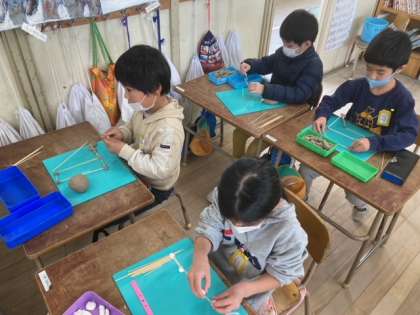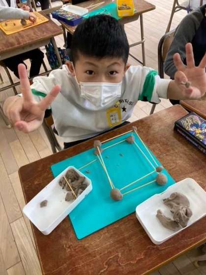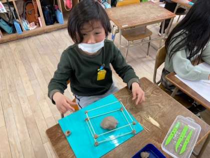 長さの違う竹串と爪楊枝、粘土を使い箱を作りました。長さのちがいに気づき、長方形の箱を作りました。苦労しながらもきれいな箱の形が完成。