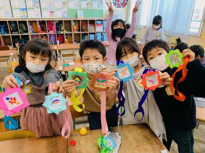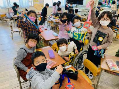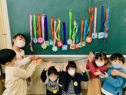 2枚のメダルの間に挟んだリボンが取れないように、のりでしっかりと付けることがとても難しかったようです。