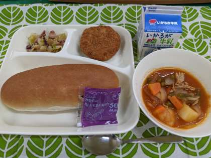 3月7日(月)のこんだては、「チキンレバーカツ、ケチャップ煮、たことキャベツのバジルソテー、コッペパン、ブルーベリージャム、牛乳」です。
