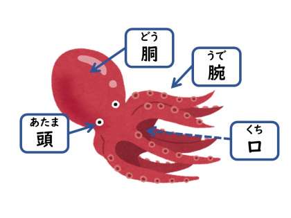 たこは、胴、頭、腕の3つの部分があります。目のあるあたりが頭で、上の丸い袋のような部分が胴です。口は8本の腕に囲まれた頭の真ん中にあります。海底の岩礁にすみ、夜に活動し、小魚、かに、えび、貝などを食べています。