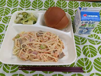 3月14日(月)のこんだては「さけのクリームスパゲッティ、キャベツときゅうりのサラダ、黒糖パン、牛乳」です。