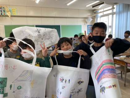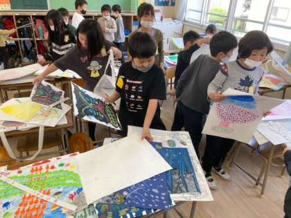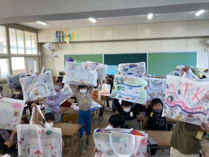 一年間でかいた絵や文を作品袋に入れて持ち帰ります。図工ではクレパスの絵や初めての絵の具での絵があり、「懐かしい」「これ頑張った」と思い返していました。お家でも作品を見てあげてください。