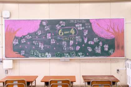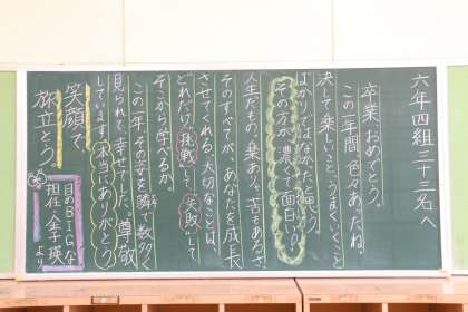 小学校最後の登校日、先生方のあたたかい黒板メッセージが子ども達を迎えます。