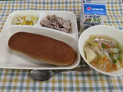 3月23日(水)のこんだては「豚肉のガーリック焼き、スープ、カリフラワーとコーンのサラダ、黒糖パン、牛乳」です。