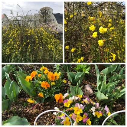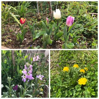 オウバイ、ストック、ヒヤシンス、ビオラ、タンポポ、サクラ、チューリップ・・・