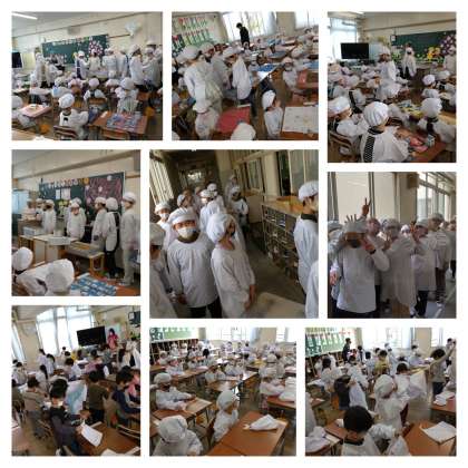 給食エプロンを着るところから始まりました。