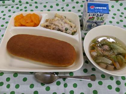4月13日(水)のこんだては「マカロニグラタン、レタスのスープ、みかん(缶)、パンプキンパン、牛乳」です。