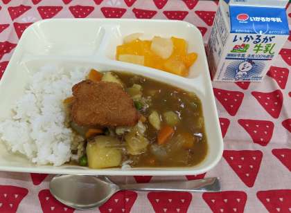 4月14日(木)のこんだては「カツカレーライス、フルーツゼリー、牛乳」です。1年生の入学をお祝いするこんだてです。