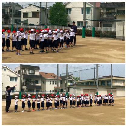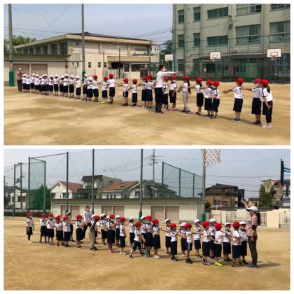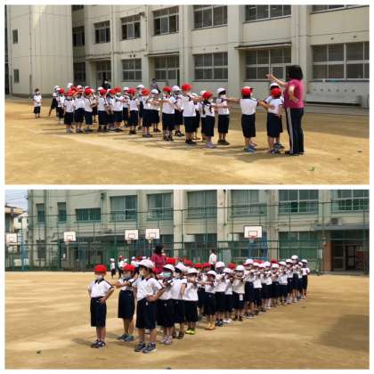 グランドにおいて、各クラスごとに集合・整列の練習をしています。