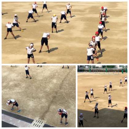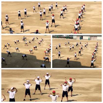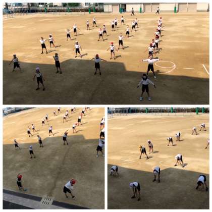 グランドでラジオ体操に取り組んでいます。