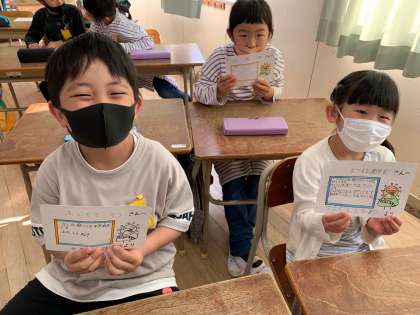 5年生と、自己紹介カードの交換をした後、一緒に王様じゃんけんのゲームをしました。