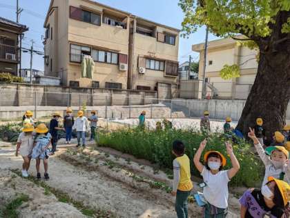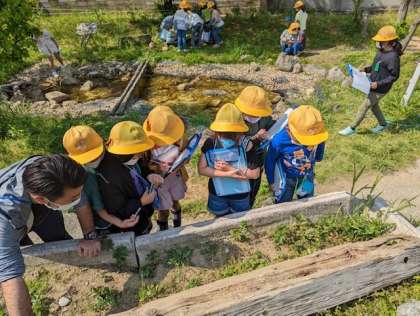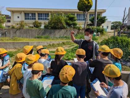 自然観察園に行き、生き物の観察をしました。見つけた生き物を観察カードにかいていきます。木の下や畑を探し、先生が捕まえたアカハライモリを真剣に観察していました。