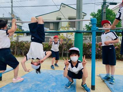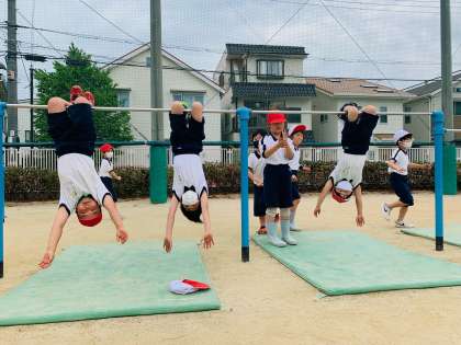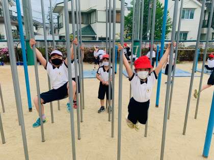 鉄棒、のぼり棒、うんていを使って、体を動かします。