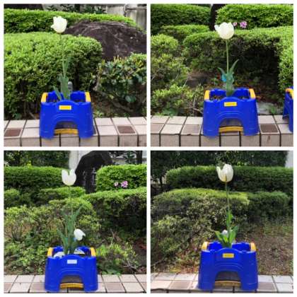 昨日の雨で、一つだけ残っていた黄色のチューリップが散ってしまい、白色の4つが残りました。最後まで残ったチューリップに拍手!!
