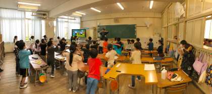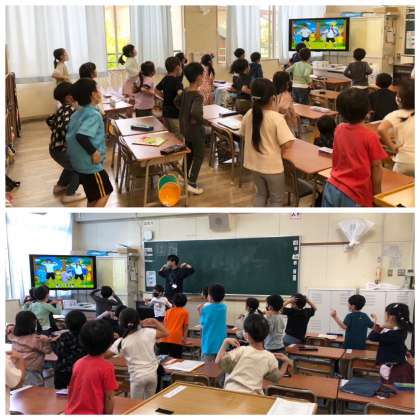 大型テレビに映し出される映像を見ながら、みんな元気に楽しく踊っています。