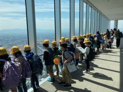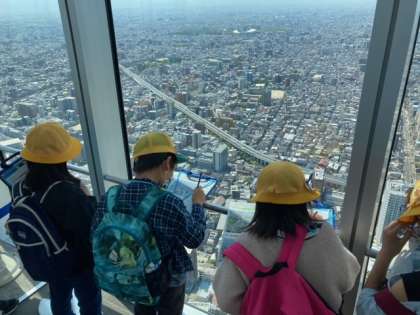 あべのハルカスに着きました。学校から歩きましたが、元気いっぱいです。グループに分かれて、大阪の東西南北を調べます。
