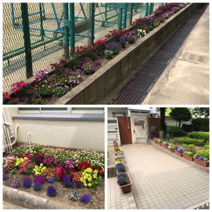 花壇やプランターに色とりどりの花が美しく咲いています。