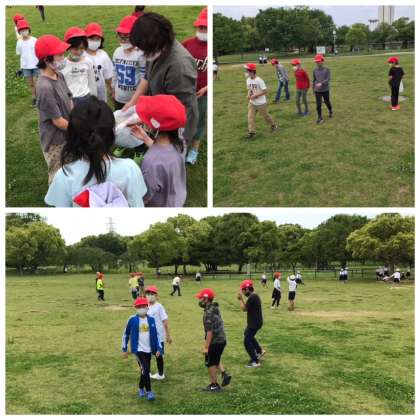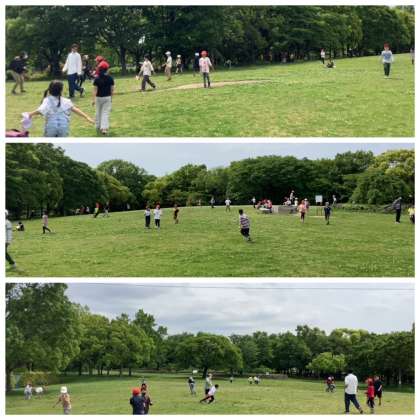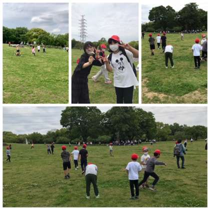 クラス写真の後、芝生広場でのびのび走り回っています。