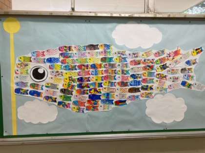 図工で作ったこいのぼりを保健室の前の掲示板に張り出しました。みんなのこいのぼりが集まり、1匹の大きなこいのぼりになりました。