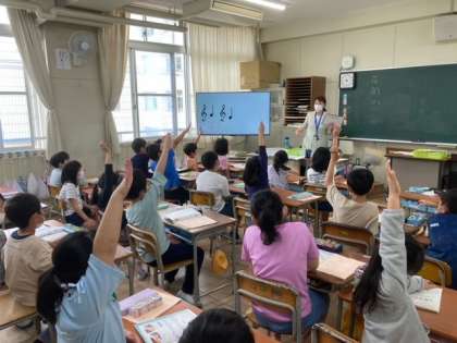 拍や拍子、音符について学びました。みんなで同じ拍で手を叩いてみたり、音符の音の長さを考えました。雨で外には出れない日でしたが、元気いっぱいに歌も歌いました。