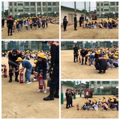 引き続き、3年〜6年生各クラス代表2名による水消火器訓練を実施。消火器の使い方について消防署員の方から説明を受けました。先生方も訓練を行いました。
