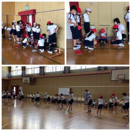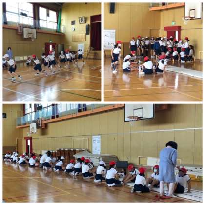 グランドでは、ソフトボール投げ(「踏力)、立ち幅跳び(跳躍力)の測定です。