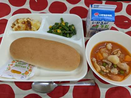 5月19日(木)のこんだては「ケチャップ煮、さんどまめとコーンのソテー、りんごのクラフティ、コッペパン、アプリコットジャム、牛乳」です。