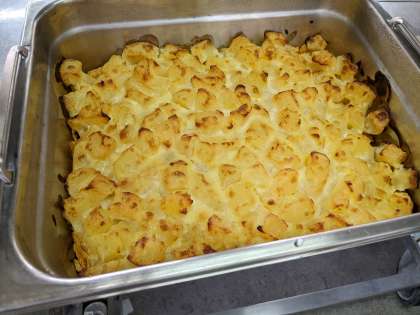 りんごのクラフティは手作りのデザートです。コーンフレークの上に、小麦粉、砂糖、卵、クリーム、りんご(缶)を混ぜ合わせた生地を流し、焼き上げます。「りんごのクラフティがおいしかったです!」と声をかけてくれる児童もいました。