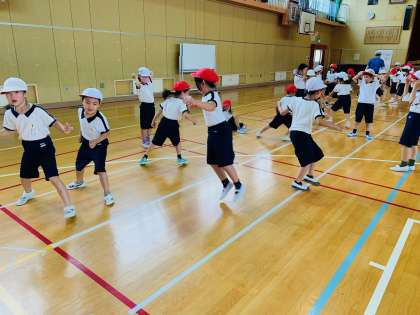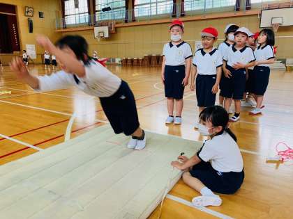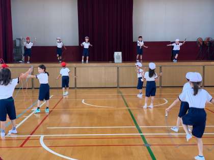 立ち幅跳びは、砂場と講堂のマット上で測定しましたが、児童によって跳びやすい場所が違うようでした。