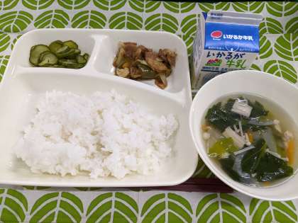5月24日(火)のこんだては「ホイコウロー、鶏肉と野菜の中華スープ、きゅうりのピリ辛あえ、ごはん、牛乳」です。