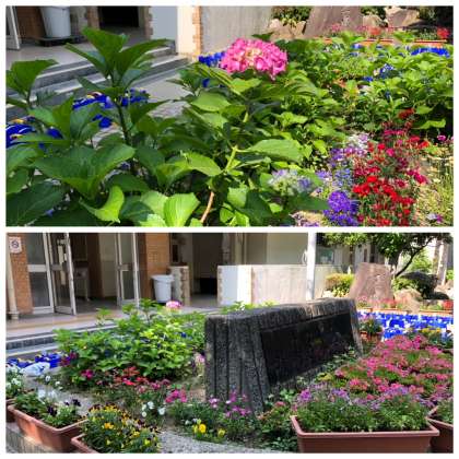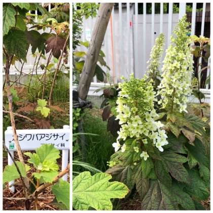 運動場の生垣として植えていただいた「カシワバアジサイ」は、いつも見慣れたアジサイとは少し違う形で、白色の花をつけています。