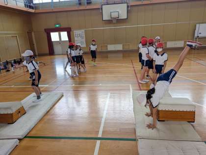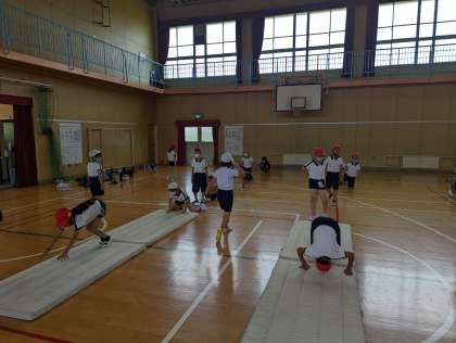 体育のマット運動の学習では、前転の練習をした後、側方倒立回転(側転)にチャレンジしました!