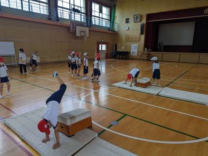 跳び箱を使って、側方倒立回転のときにどのような順にどのへんに手をついたり、足を振り上げたりすればよいのかイメージできるように練習をしているところです!