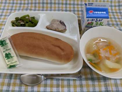 5月30日(月)のこんだては「かつおのガーリックマヨネーズ焼き、スープ、グリーンアスパラガスとベーコンのソテー、コッペパン、マーガリン、牛乳」です。