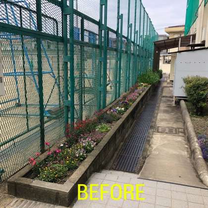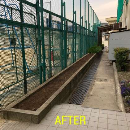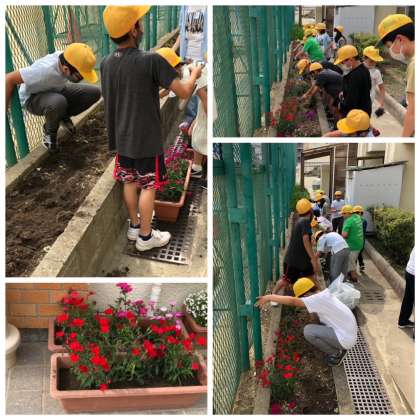 その苗を植えるために、花壇の整備を栽培委員が行いました。まだ咲いているパンジー・ビオラ、ロベリア、キンギョソウは少し残念ですが処分し、ナデシコだけはプランターに植え替えました。