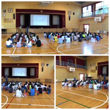 2時間目は、講堂において「ゴミの問題」について、ごみをへらすためにできることはなにか、ごみの分別(大阪市は5種類)など、お話を聞いて学習を深めました。