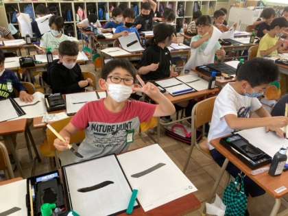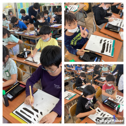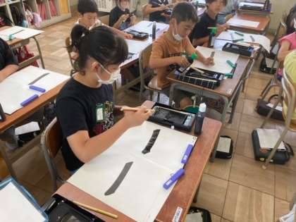 初めての習字をしました。筆をおろすところからしました。力加減を考えて、漢数字の「一」を書きました。姿勢を整え、一画に集中していました。書き終えると「緊張した」「思ったより太くなった」などと沢山の感想がありました。