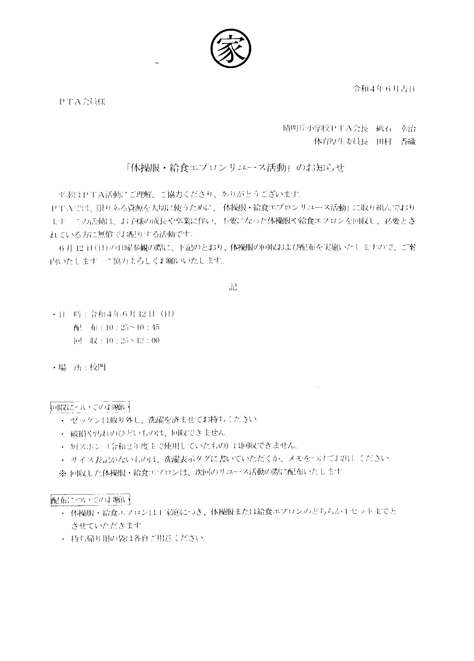 ◆「体操服・給食エプロンリユース活動」のお知らせ