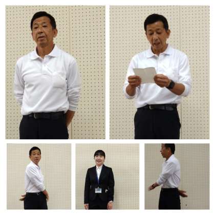 今日は放送による朝会なので、ラジオ体操ワンポイントレッスンは大きく動けません。体をねじる運動について、簡単に説明します。腕を体に巻き付けるようにしてねじります。その時に、顔も一緒にねじることが大切です。