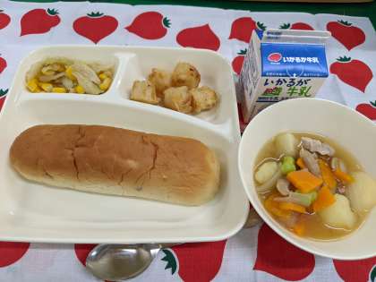 6月7日(火)のこんだては「いかてんぷら、フレッシュトマトのスープ煮、サワーソテー、おさつパン、牛乳」です。