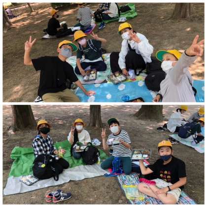 シートを広げて輪になって仲良く食べています。